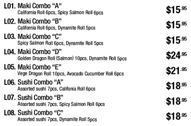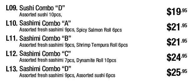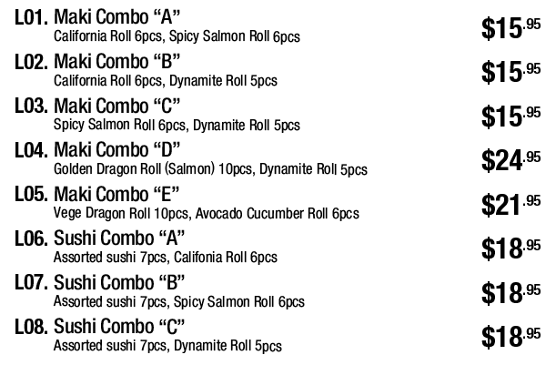 Please inform us if you have any food allergy when ordering If you need to substitute any sushi, sashimi, or sushi roll. Please ask for extra charges cost from our worker. Prices are subject to change without notice